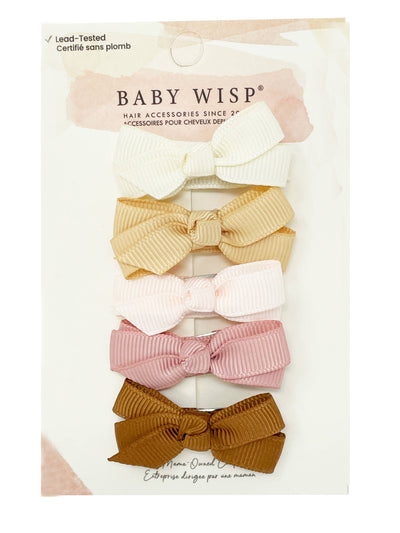 This gift set includes 5 Chelsea Grosgrain Boutique tied hair bows sized for infants and toddlers with fine hair. Styled in sandy toned colors. These high quality grosgrain ribbons tied into our 'boutique style' bow on hairclips for fine, wispy hair is the perfect hair accessory to any outfit. The boutique hair bow has a little knot in the centre with loops on the sides. Moms love to show off this intricate grosgrain ribbon toddler bow!