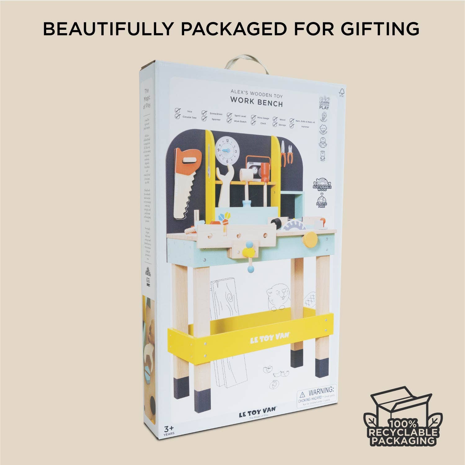 Suitable for ages - 3 years+Dimensions: W:500mm D:390mm H:775mmMade of FSC®-certified woodA sturdy toy workbench complete with 12 accessoriesAward winning toyPromotes creativity through playSafely tested for 3 years+