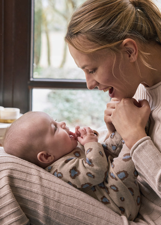 Long sleeved Dress for baby girl. Round neckline. Button fastenings down the back to allow the garment to be put on and taken off easily. Knitted fabric, soft and pleasant to the touch. Gathered design. Jacquard stitch designs.