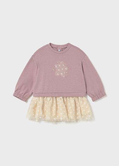 Long sleeved Dress for baby. Round neckline. Designed with non-detachable pullover. Back snap closure. Made with lightweight, sheer tulle fabric. Includes an inner lining. Decorative elements: decorative appliques, glitter.