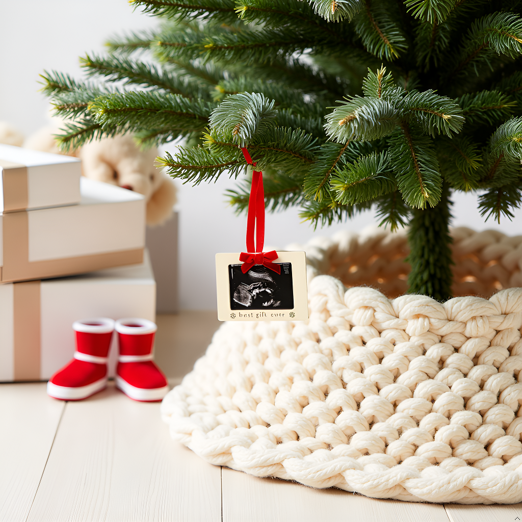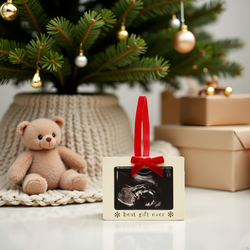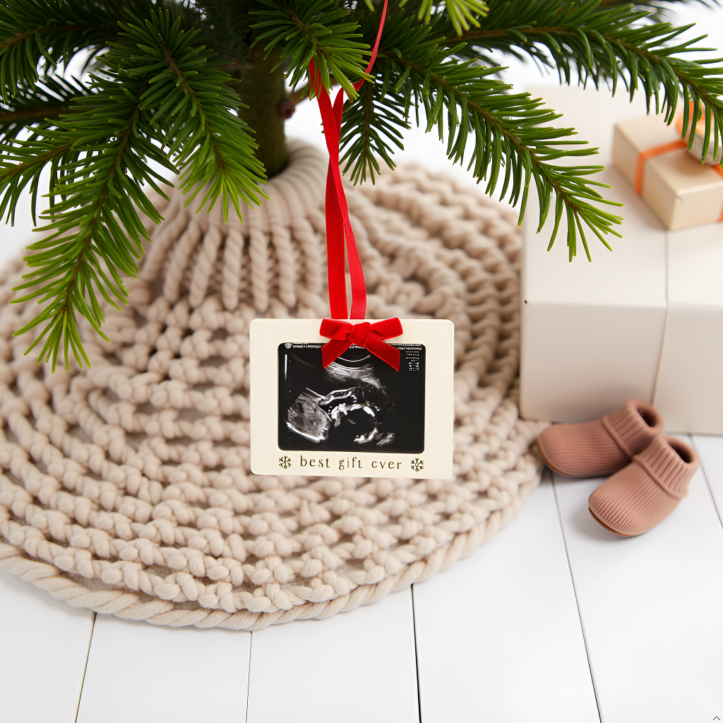 - This wooden photo frame ornament features the words “best gift ever” with two snowflakes and an attached red velvet ribbon to hang from the Christmas tree. It includes swing tags to easily insert a 2.5 x 3.5 inch sonogram photo