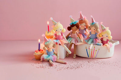 Faux linen doll features sweater knit yarn hair, party hat and rainbow mesh tutu skirt.