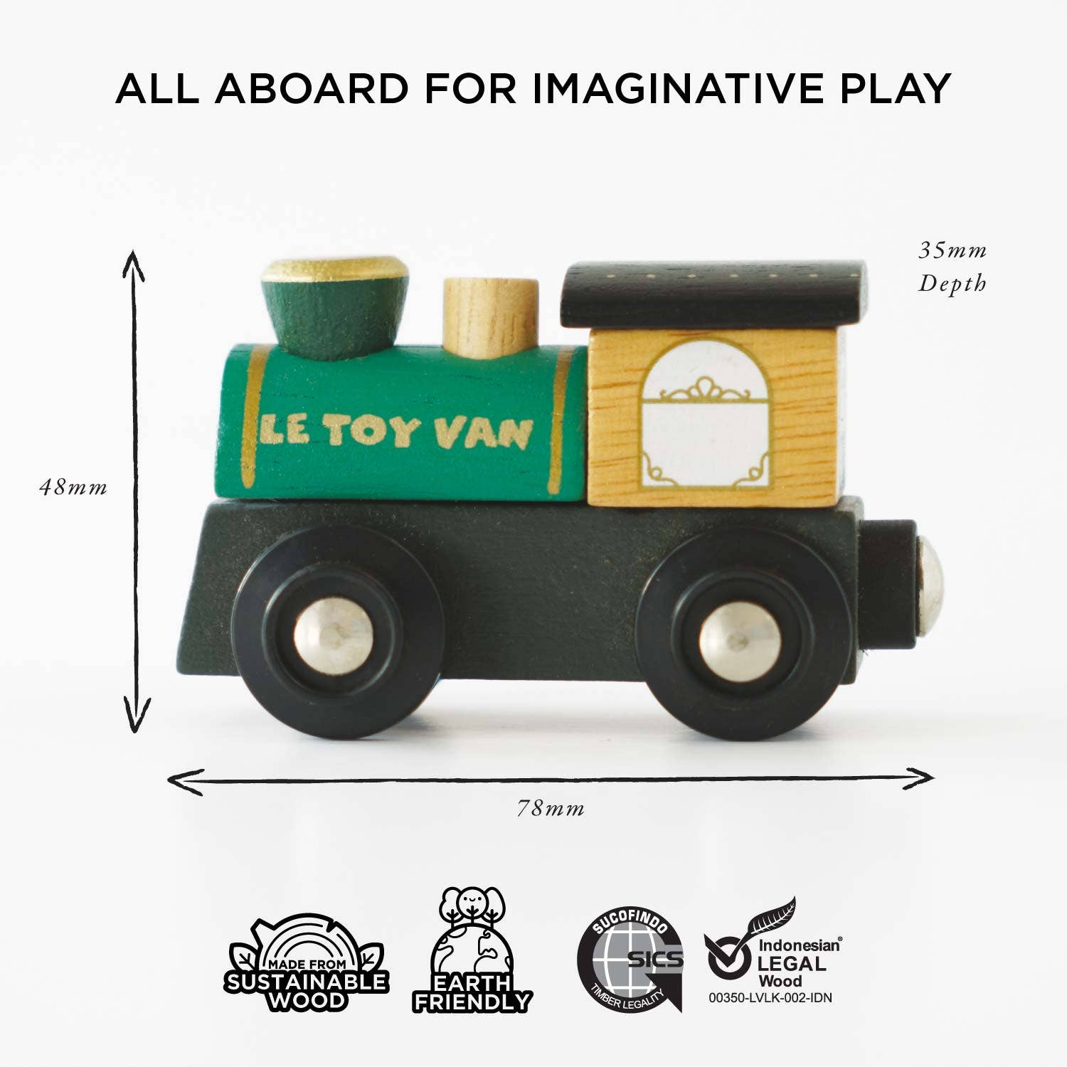 This beautiful, handmade toy train is ready and waiting for adventures and makes a great addition to any wooden train set. A perfect toy for encouraging creative play, this travelling goods locomotive will whisk little ones away on a journey of imagination, as it makes its essential deliveries. High-quality illustrations adorn each of the 5 carriages, all finished with a flourish of golden paint for a unique touch. This interactive set features magnets that connect the carriages together. A lovely activity to help refine motor skills and aid social interaction. Compatible with our and other brands of wooden train tracks.