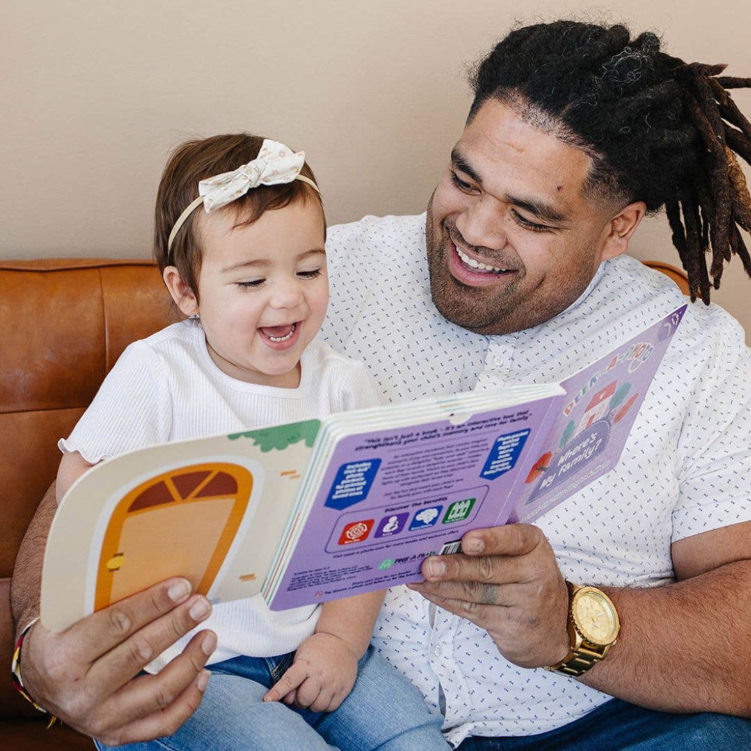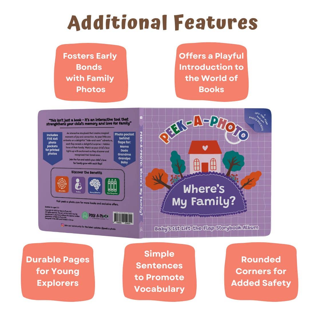 Where's My Family? - A Personalized Peekaboo Board Book with Photo Pockets Discover our innovative peekaboo storybook albums designed specifically for babies and toddlers ages 0-3. Think peek-a-boo with family photos, where little ones discover you! Our patent-pending lift-the-flap storybook albums combines the durability of traditional board books with the personalization of family photos, creating meaningful bonding moments during storytime. Each beautifully illustrated page features a delightful lift-the-flap surprise, revealing five hidden photo pockets for: Mama, Dada, Grandma, Grandpa, & Family Photo or Child.