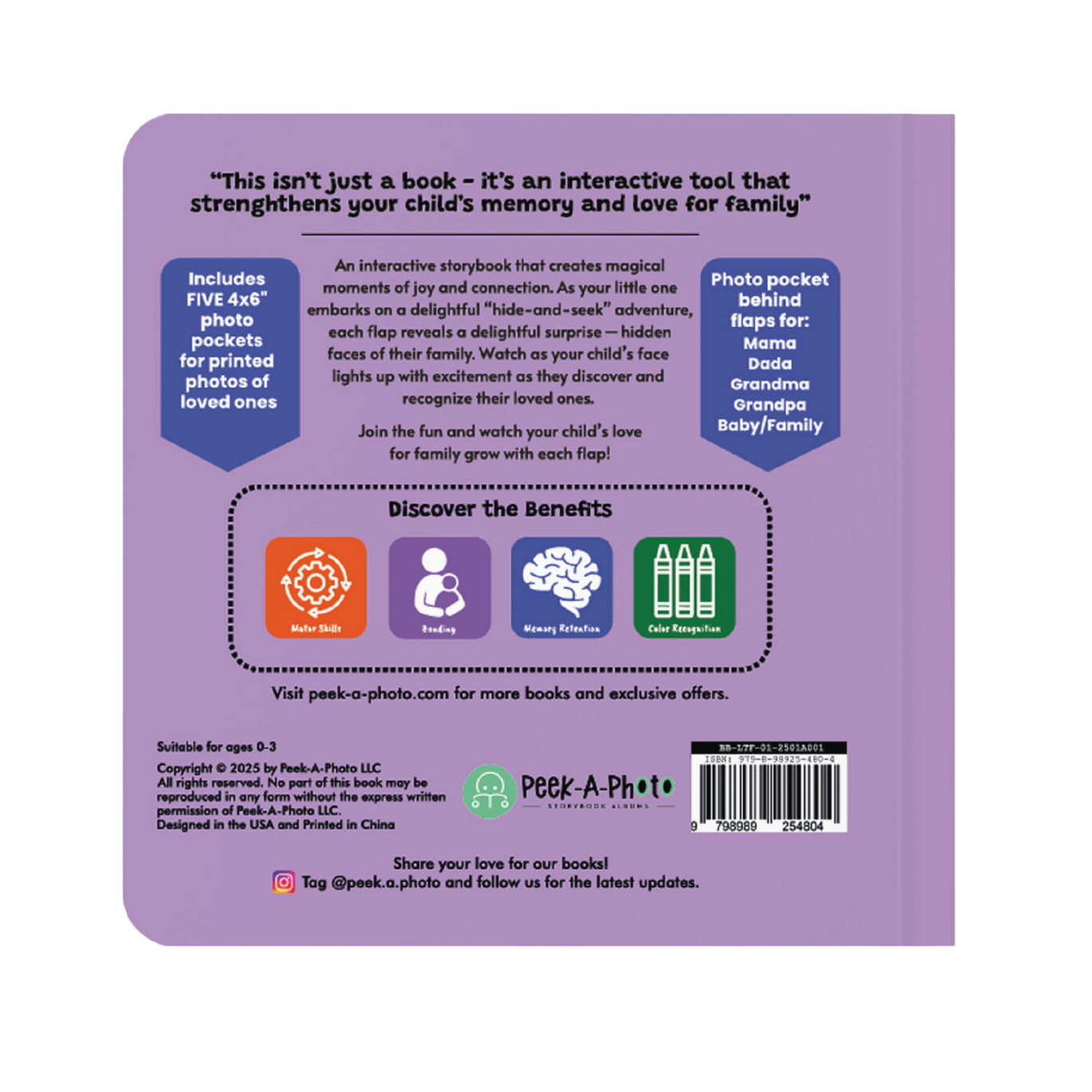 - Hidden photo pockets that let you customize the book with real 4x6" family photos (portrait orientation)