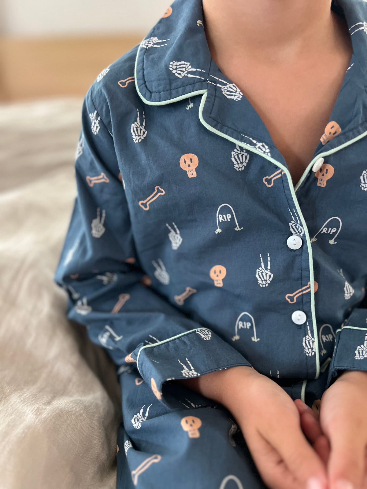 Spooky, cool 'peace sign' skeletons, tombstones and more adorn these hand drawn jammies. So cute, it's scary! Perfect for sweet dreams and Halloween giggles, these jammies turn bedtime into a fun-filled adventure!