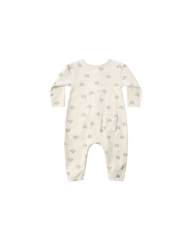 This long sleeve jumpsuit is an easy go-to, featuring coconut buttons down the front and a small back pocket for a simple finish. Hidden snaps along the inseam on sizes 0-3M - 18-24M make for easy changes.