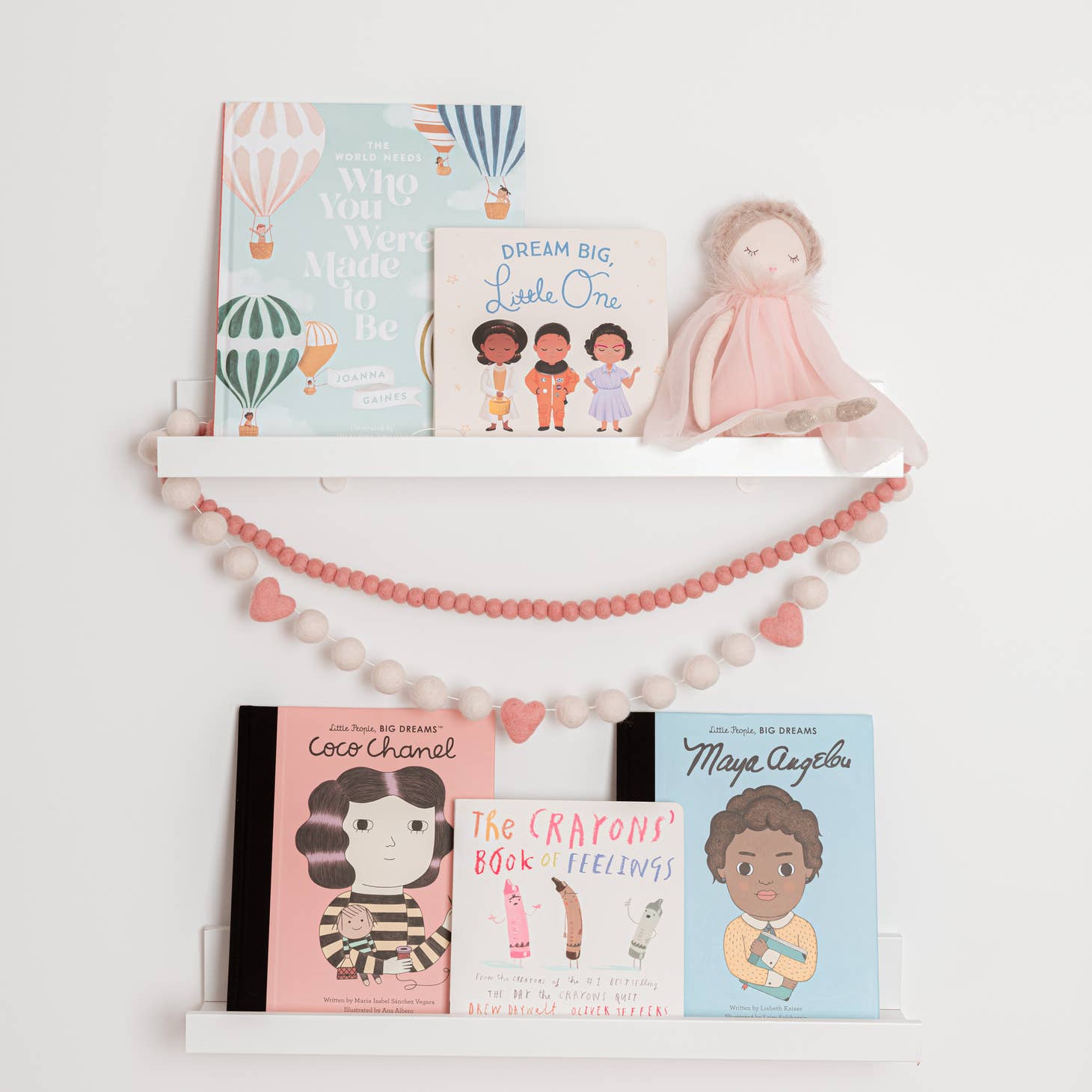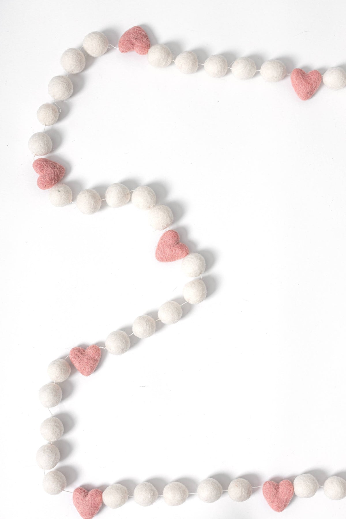 Our garlands are the perfect accessory for your nursery, milestone photos, birthday backdrop or holiday display! This blush heart garland features white felt balls between blush hearts. We've designed our garlands to be longer in length so they can fit across shelves, doorways, staircases, tables and more!