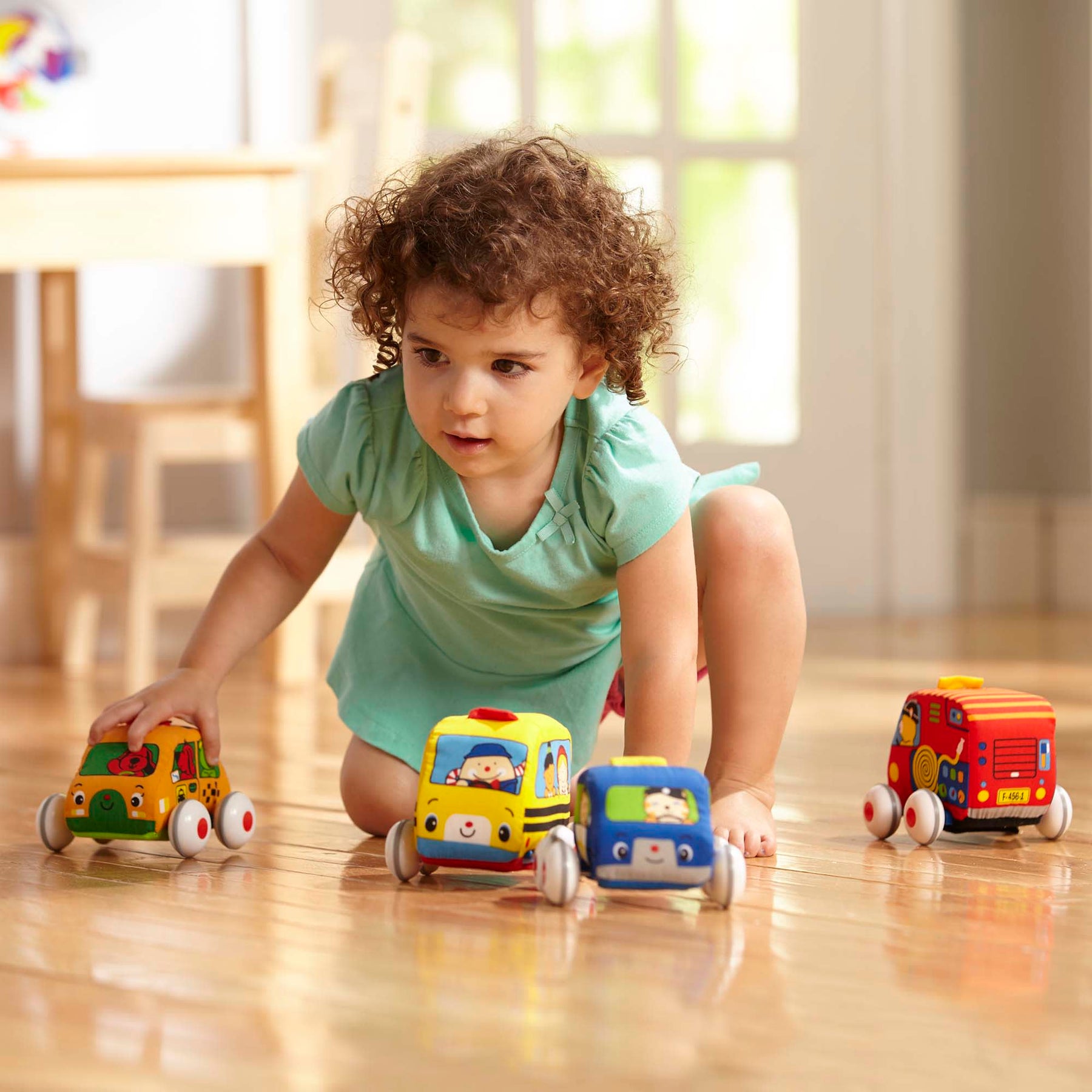 Wheel them back to get new skills speeding ahead! The "rev up" mechanism inside each of these four cars and trucks makes it easy for babies and toddlers to get big acceleration with just a little input: Pull back one of the soft vehicles--then release to see it zoom off across the floor! The action of grasping and pulling back is great for fine motor skills and hand-eye coordination; the activity of "driving" and collecting (pull, release, crawl) benefits large muscle groups and coordination, too. Get even more "miles per gallon" with a variety of colors, shapes and sizes, illustrated characters, and everyday themes to inspire conversations, cognitive connections, and imaginative play! These soft fabric vehicles are bound to be popular at playtime, but with four exciting vehicles there are enough to share. And parents and caregivers will be grateful for the removable wipe-clean wheelie insert and washable fabric surface! Melissa & Doug K's Kids toys nurture early childhood development in three key skill areas: physical, cognitive, and social. With interactive designs and multisensory features, K's Kids promotes constructive play and effortless learning, keeping interest high and new skills flourishing throughout the baby and toddler years!