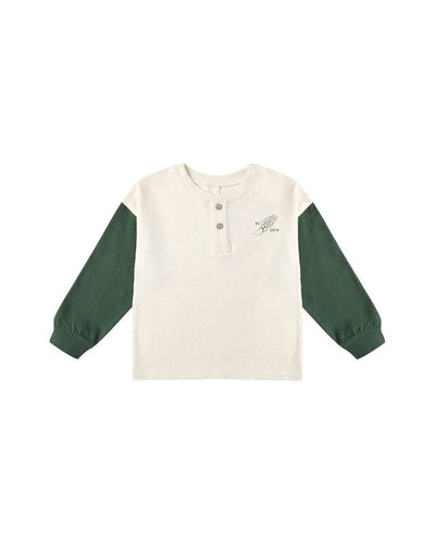 Add vintage track-and-field vibes to your wardrobe with this relaxed-fit long sleeve tee, featuring contrast sleeves and a center front button placket.
