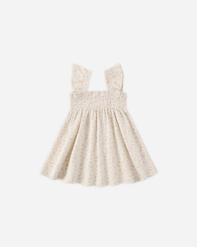 Sweet and easy dress with a smocked bodice, ruffle detail on the straps, and a full skirt. Coordinating bloomers included.