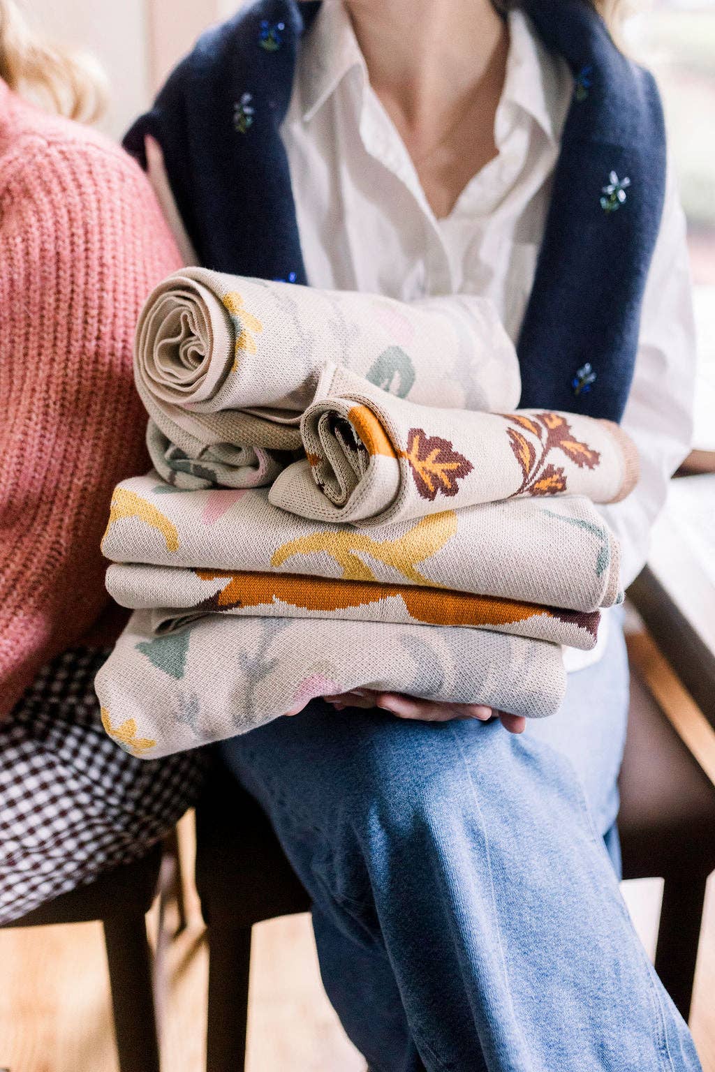 Playful and artful, the Sun Bunny Cotton Knit Blanket captures the warmth of a sunlit meadow. Hand-drawn florals and leaping bunnies are arranged in a balanced, folk-inspired design — soft hues of blush, gold, and sage create a palette that feels both joyful and refined.