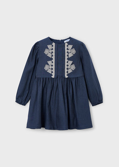 Long sleeved Dress for girls. Round neckline. Opening on the back with an invisible zip. Combination of different fabrics to achieve a unique and special design. Includes an inner lining. Gathered design. Decorative elements: embroidery.