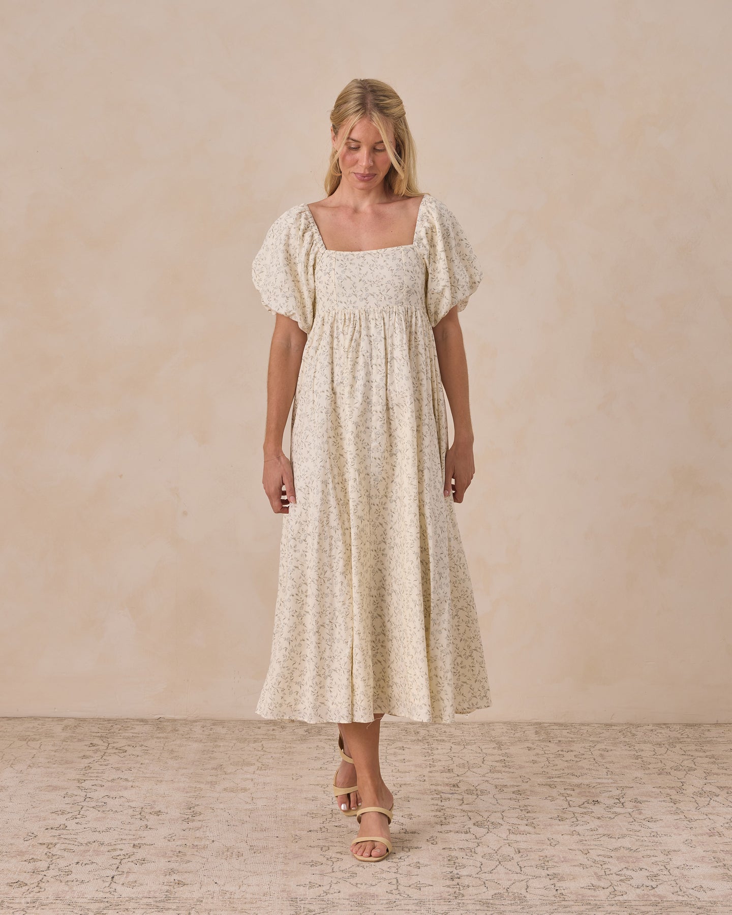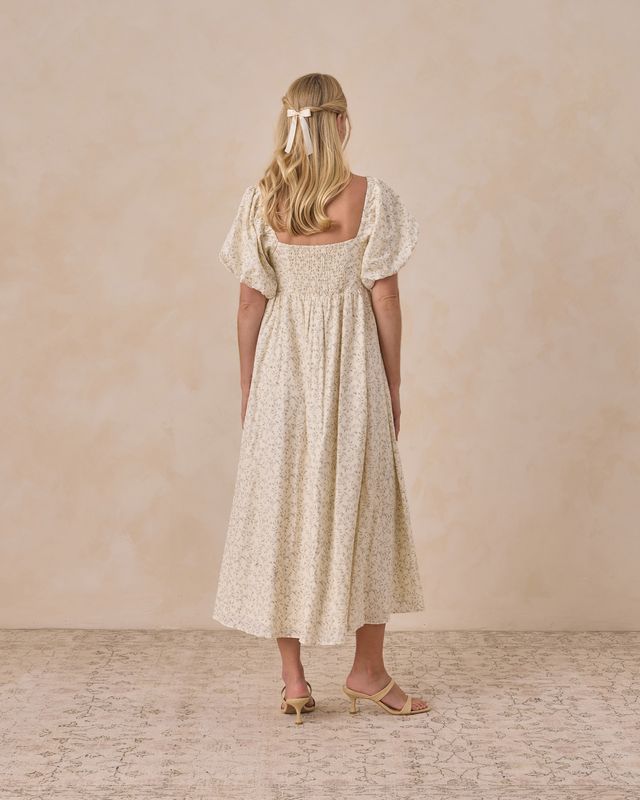 Empire waist maxi dress with bubbled sleeves and a smocked back bodice for a great fit.